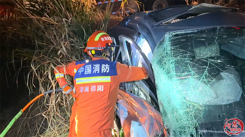 近日,邵陽縣諸甲亭鄉(xiāng)街上一輛貨車與小轎車發(fā)生劇烈碰撞后,小轎車失控沖出路面墜入路邊坡下,巨大的沖擊力導致轎車駕駛室嚴重扭曲變形,駕駛員被卡在駕駛座上無法動彈。接警后,邵陽縣消防救援大隊立即調(diào)派救援人員趕赴現(xiàn)場進行處置。